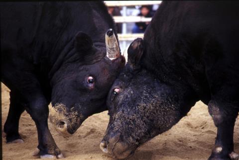 定期闘牛大会の秋場所。1トン級の巨牛が激突する。角と角がぶつかり合う激しい攻防戦をぜひ会場で楽しもう。
