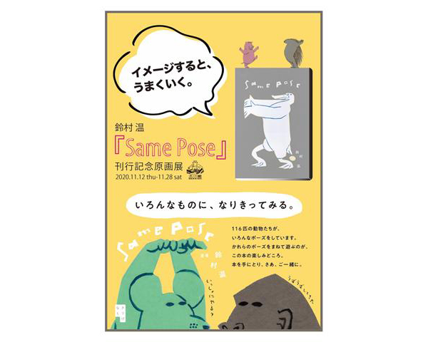 すべて切り絵で描かれた116匹の動物たちのポーズを真似して遊ぶプレイブック『Same Pose』の出版を記念して原画展を開催。この展示のために制作したグッズの販売や、オンラインによる似顔絵イベント(要予約)も予定。詳細はHPやSNSへ。