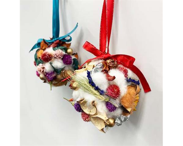 球体のおしゃれなオーナメント。ドライフラワーや歴博で栽培した綿を使ってフラワーボールを作ってみよう。材料がなくなり次第終了。