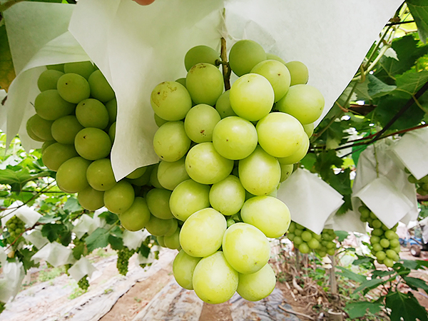 「ネオマスカット」「紫玉」「藤稔」「シャインマスカット」「安芸クイーン」「甲斐美嶺」「ブラックオーパス」「ブラックビート」の順に収穫を迎えるので、食べたい品種がある人は問い合わせてみて。