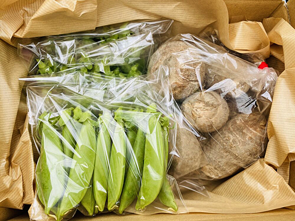 内容は野菜(スナップエンドウや里芋など)の収穫や苗定植など。