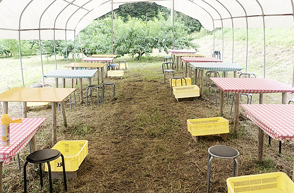 また、貸し出し用のナイフ&カゴの消毒をしたり、園内にあるベンチの間隔を空けたりしています。
