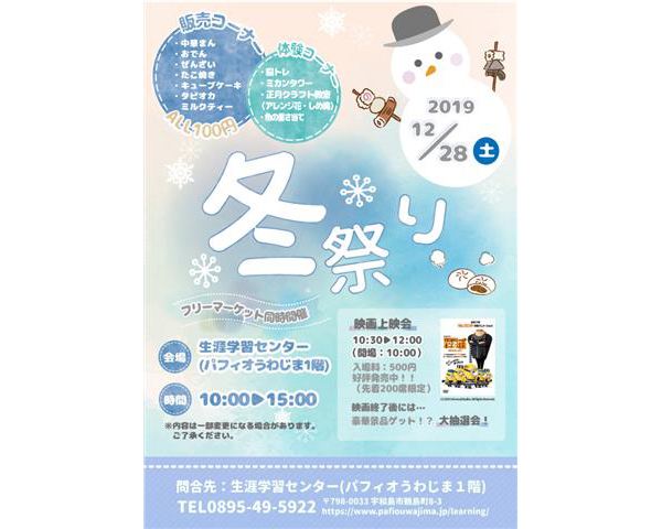 映画「怪盗グルーのミニオン大脱走」や中華まんやタピオカなど全て100円の食品販売あり。その他、お正月教室(しめ縄・アレンジ花※どちらも要予約)やミカンタワーなどのゲームも盛り沢山! フリーマーケットも同時開催。