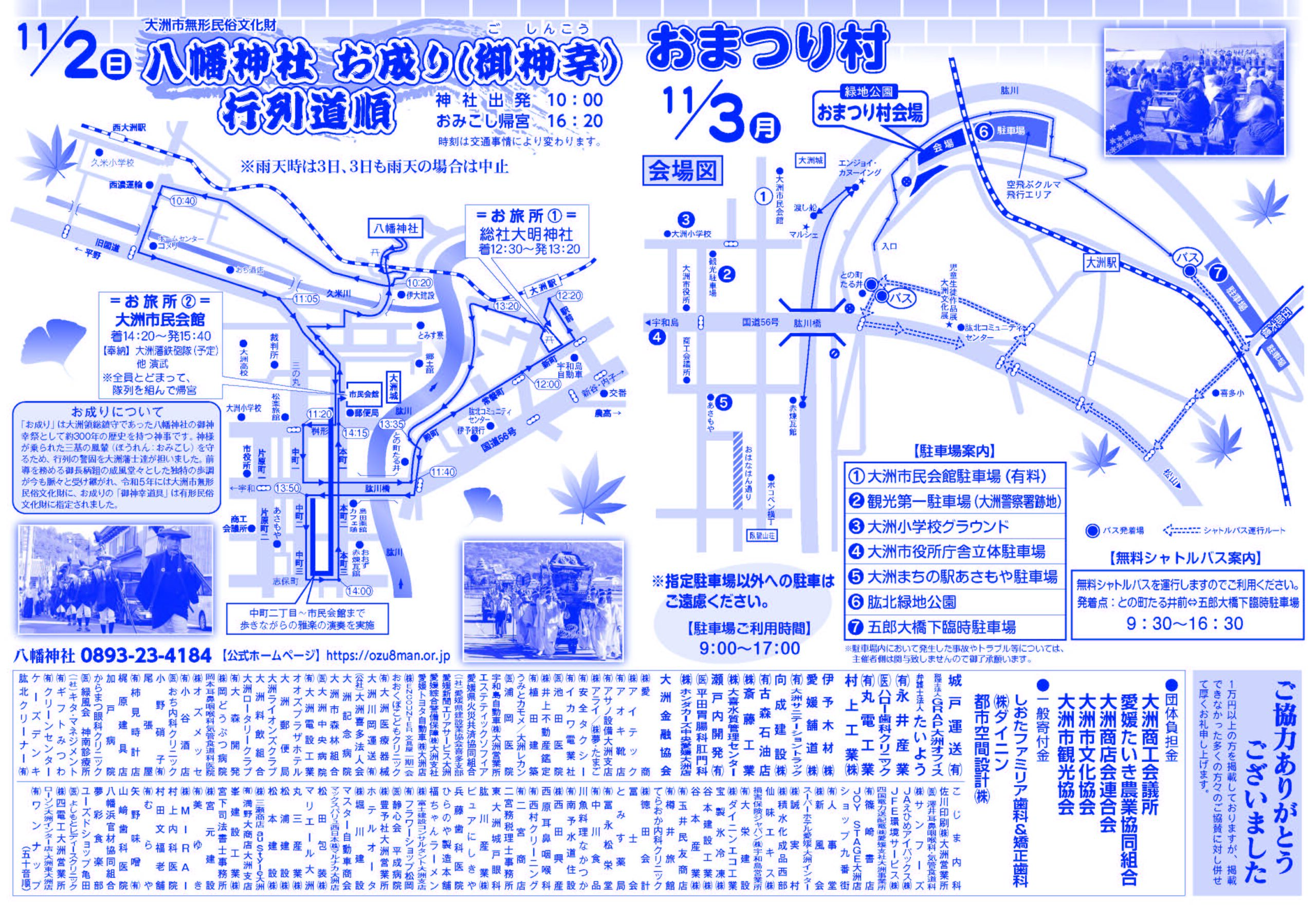 11/2(日)は江戸時代の装束で八幡神社から大洲市内を練り歩く伝統の「お成り」や、子供神輿パレードなど見るだけでも楽しいイベントがめじろ押し!
