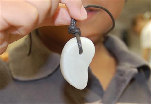 軟らかい石(滑石。白・ピンク・黒色から選ぶ)を削り、ピカピカに磨いて自分だけの個性的な勾玉をつくってみよう!