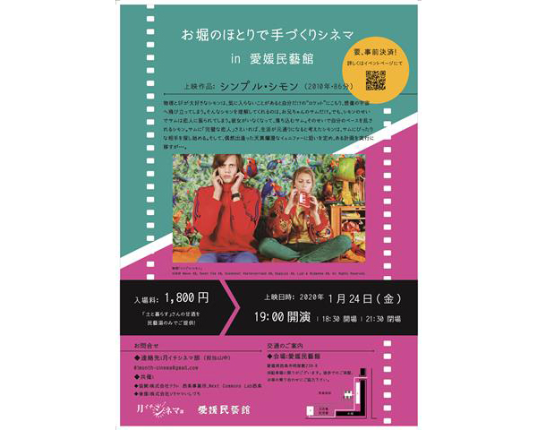 西条のお堀に浮かぶ四国唯一の民藝館で「映画」と「西条市の魅力」に触れられるイベント。第一回上映作品は『シンプル・シモン』。館内の吹き抜けを活かし、190インチのスクリーンを設置。西条産米使用の甘酒の振る舞いもあり。