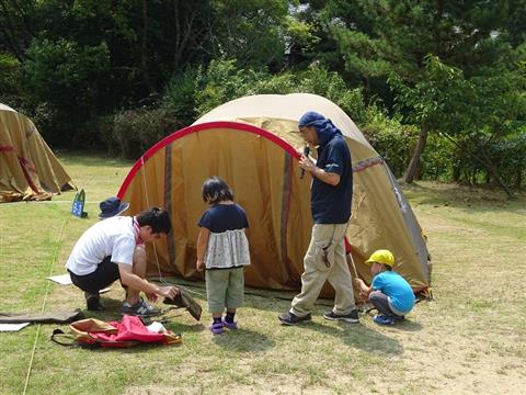 キャンプ初心者を対象に、テントやタープの設営体験と、野外活動センターの「かまど」を使ってカレーライスを調理する飯盒炊飯の体験ができる。講師:野外活動センター職員