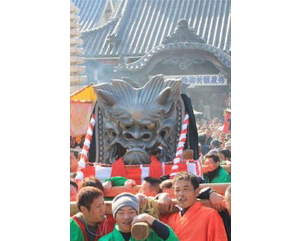 弘法大師ゆかりの同寺において、護摩大祈祷、町内61歳(還暦)男女による餅まき、町内42歳(厄年)男性による鬼瓦みこしが繰り出し賑わう。