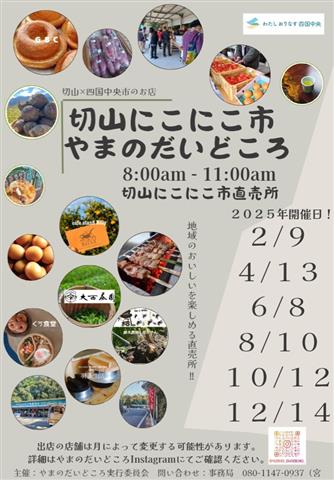 四国中央市のお店のこだわりのおいしいもの、四国中央市の各地域や地元切山地域の農作物など地産地消の野菜、たまごなど販売!名物豚串は現地で炭焼きし販売している。
