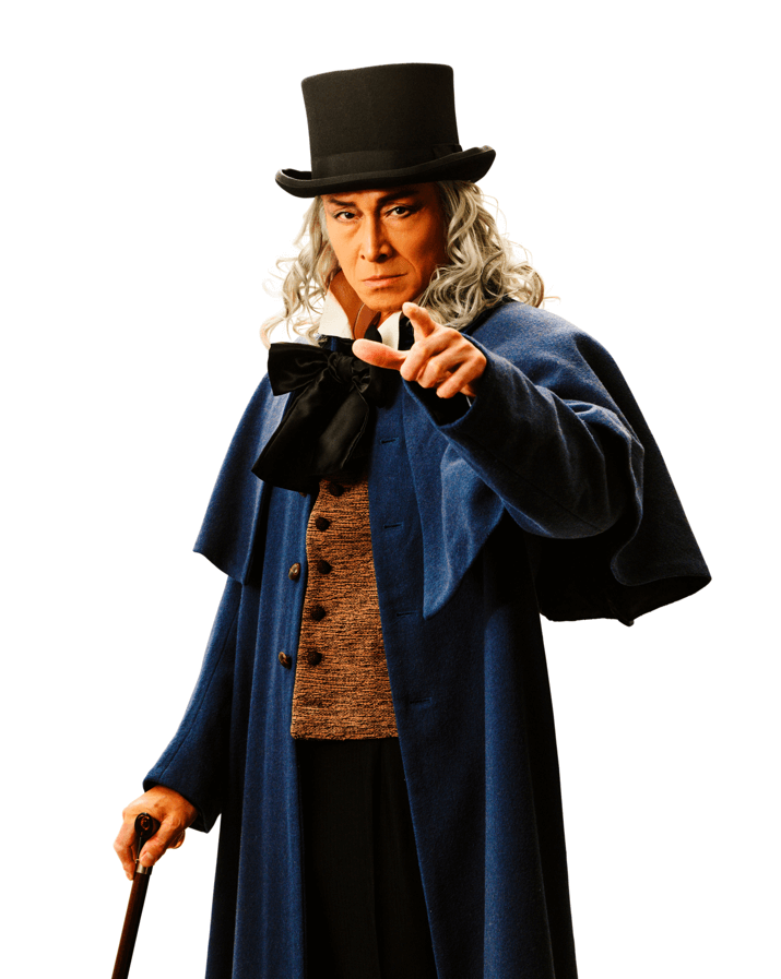 主人公スクルージを演じるのは、実力派俳優・吉田栄作さん。強欲な老人が過去・現在・未来を旅し、心の変化を遂げていく様子を、力強い演技で描き出します。