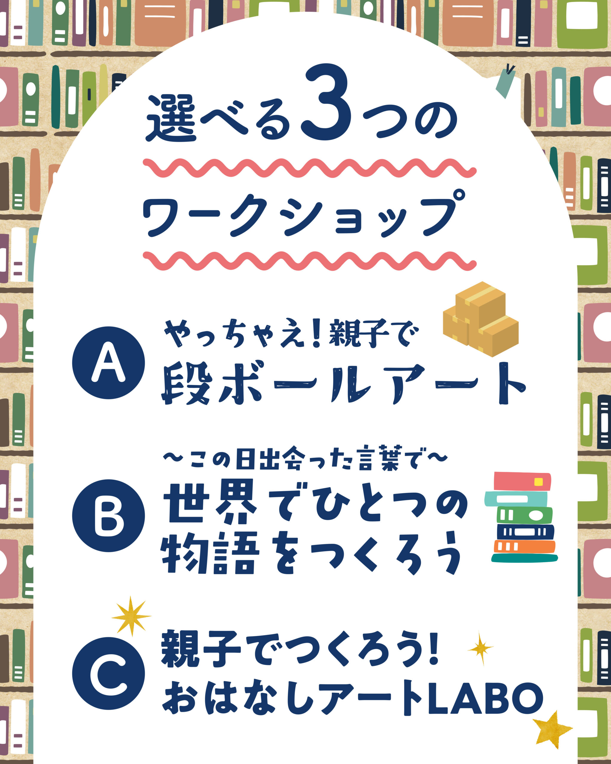 今回は、3種類のワークショップを同時開催!好きなテーマを1つ選んで参加できます。参加は無料で、各6組・合計18組限定。事前申込が必要なので、気になる方はぜひお早めにチェックしてください。