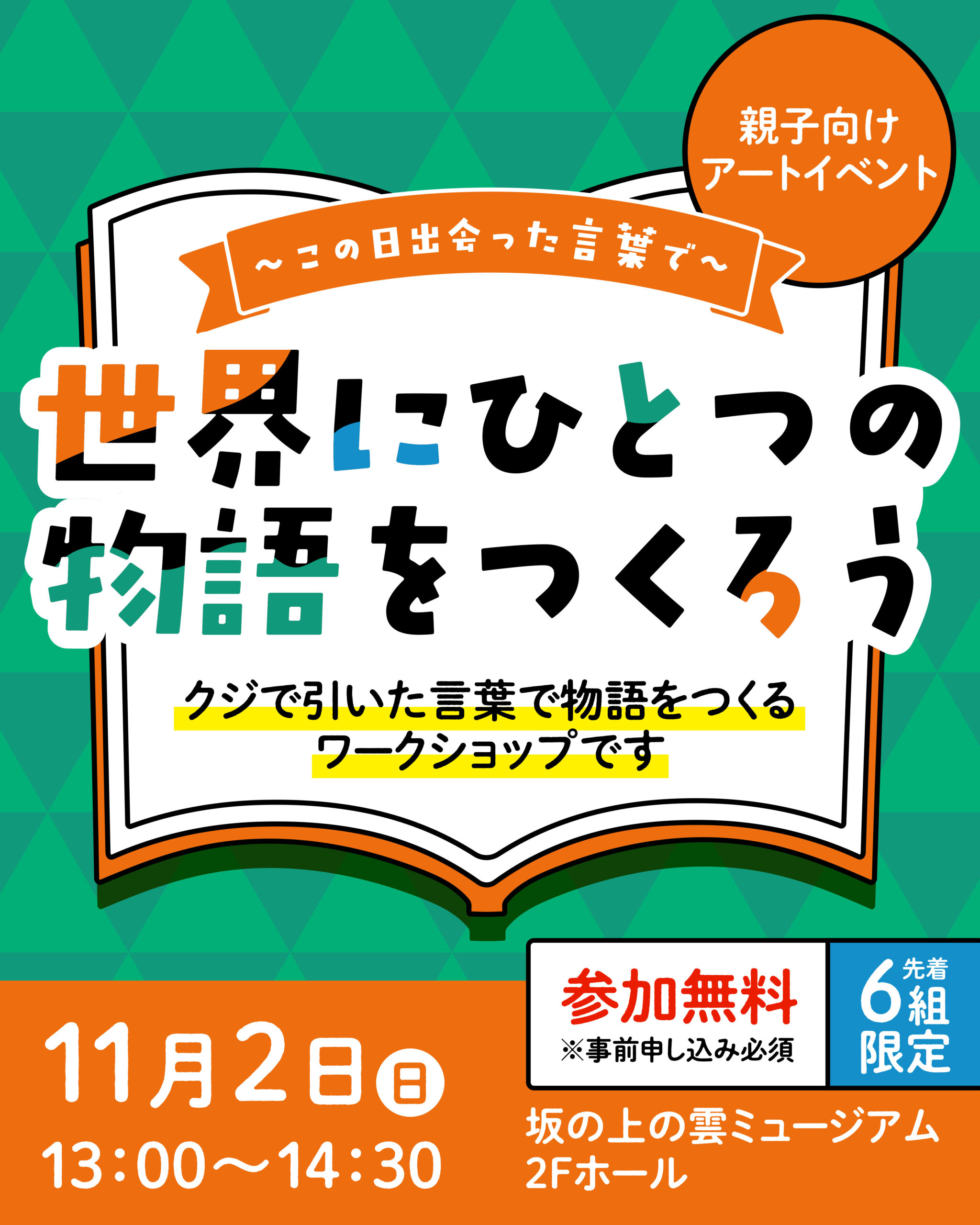 くじを引いて出た言葉をテーマに、親子でオリジナルの物語をつくるワークショップ。自由に描いたり書いたりしながら、想像力をふくらませて楽しめます。