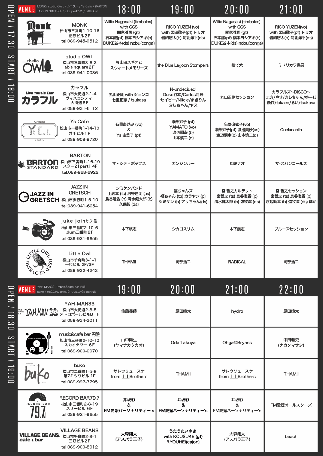 - 場所:MONK、studio OWL、カラフル、Ys Café、BARTON、JAZZ IN GRETSCH、juke jointつる、Little Owl、YAH-MAN33、music&café bar 円盤、buko、RECORD BAR79.7、VILLAGE BEANS