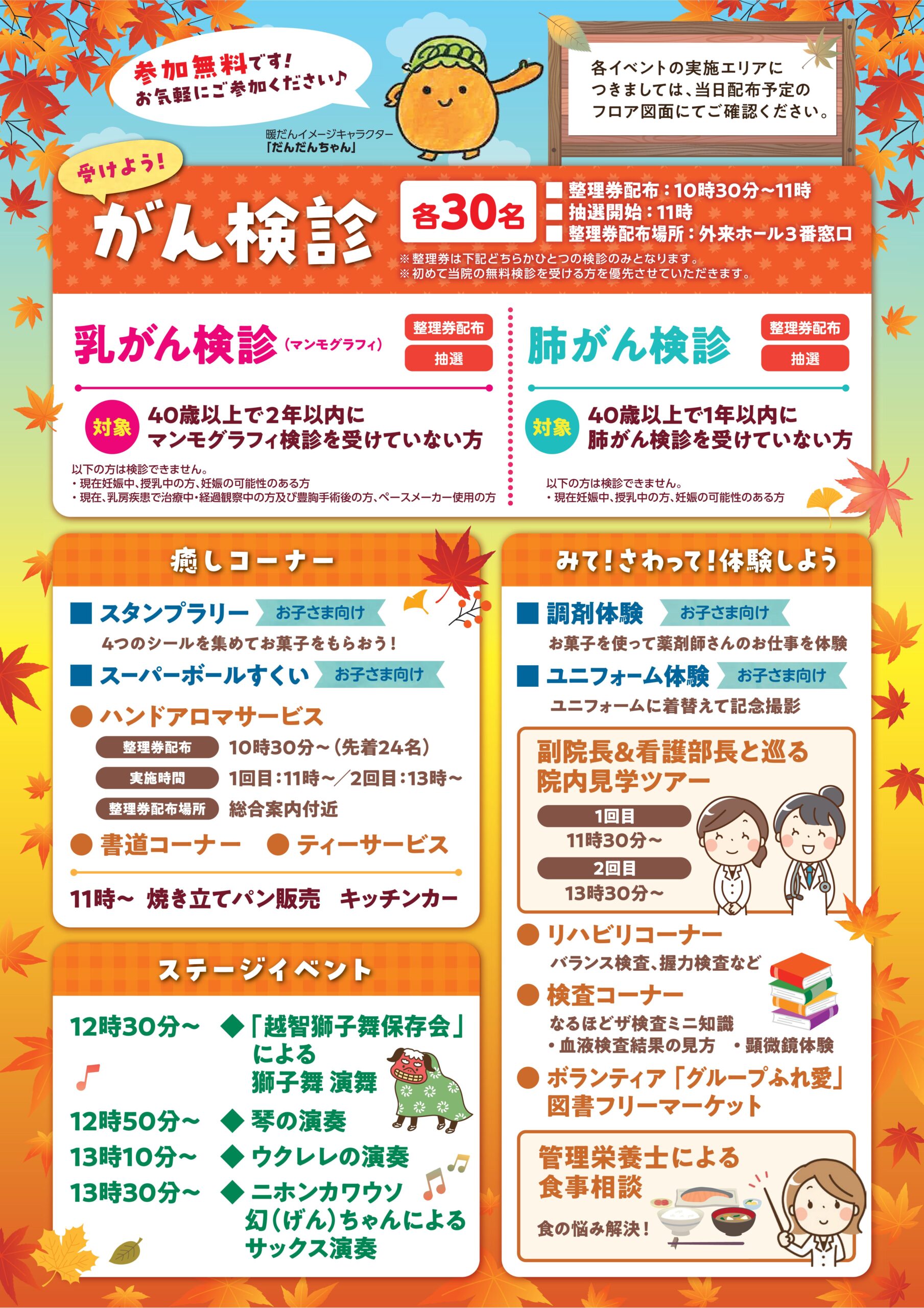 がん専門病院で検診を体験できるチャンスです。定員は計60名です。詳細は当日チラシをご確認ください。