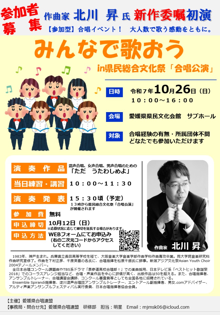 歌い手として参加したい方の募集も行われており、詳細や申し込みは愛媛県合唱連盟のホームページやチラシで案内されています。