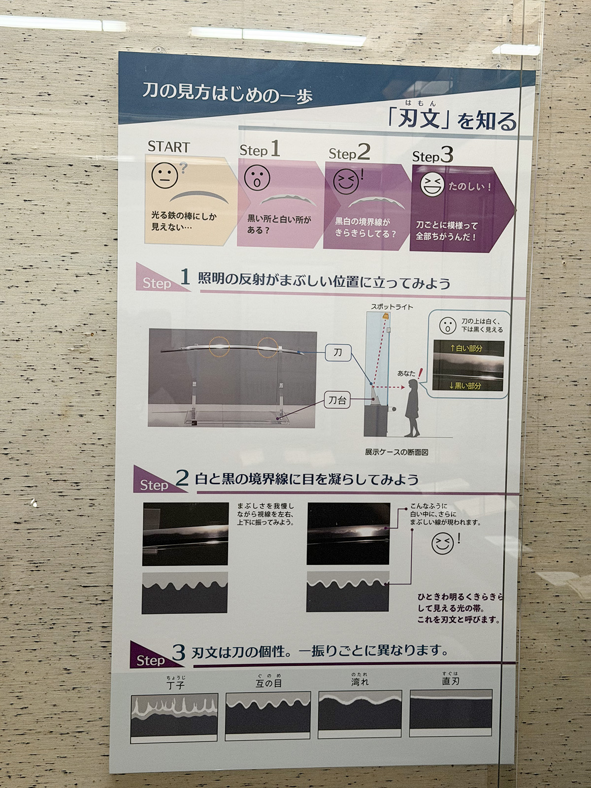 あ、刀ってどう見たらいいのかよくわからない…という方に、わかりやすい刀の見方のパネルもあるので参考にしましょうね。