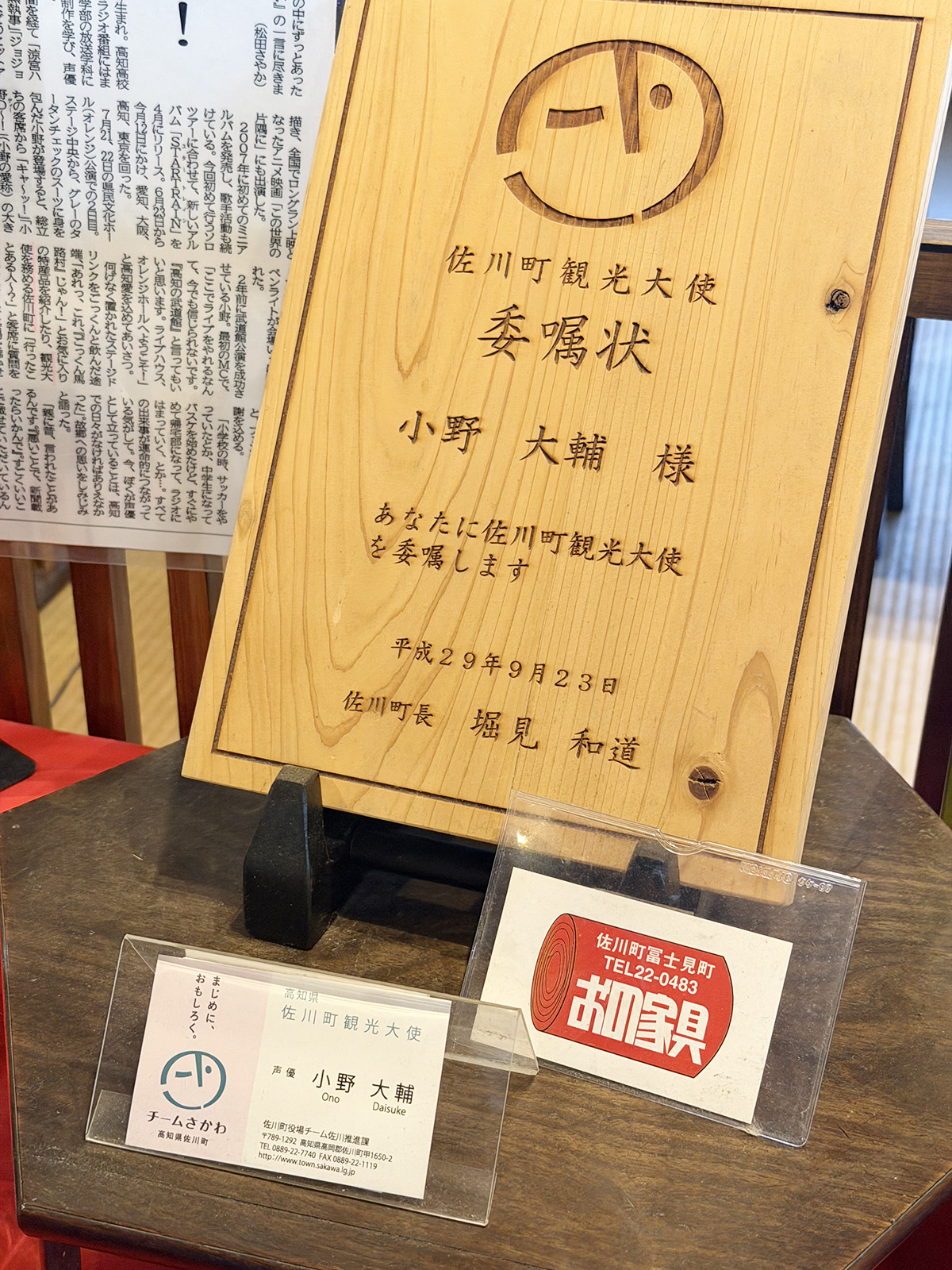 あ、知ってる人も多いかもしれませんが、高知県出身の人気声優・小野大輔さん、実は佐川町出身だそうです。ということで佐川町観光大使に就任されているそうです。なかなか味わいのある委嘱状を見ることもできますよ~。