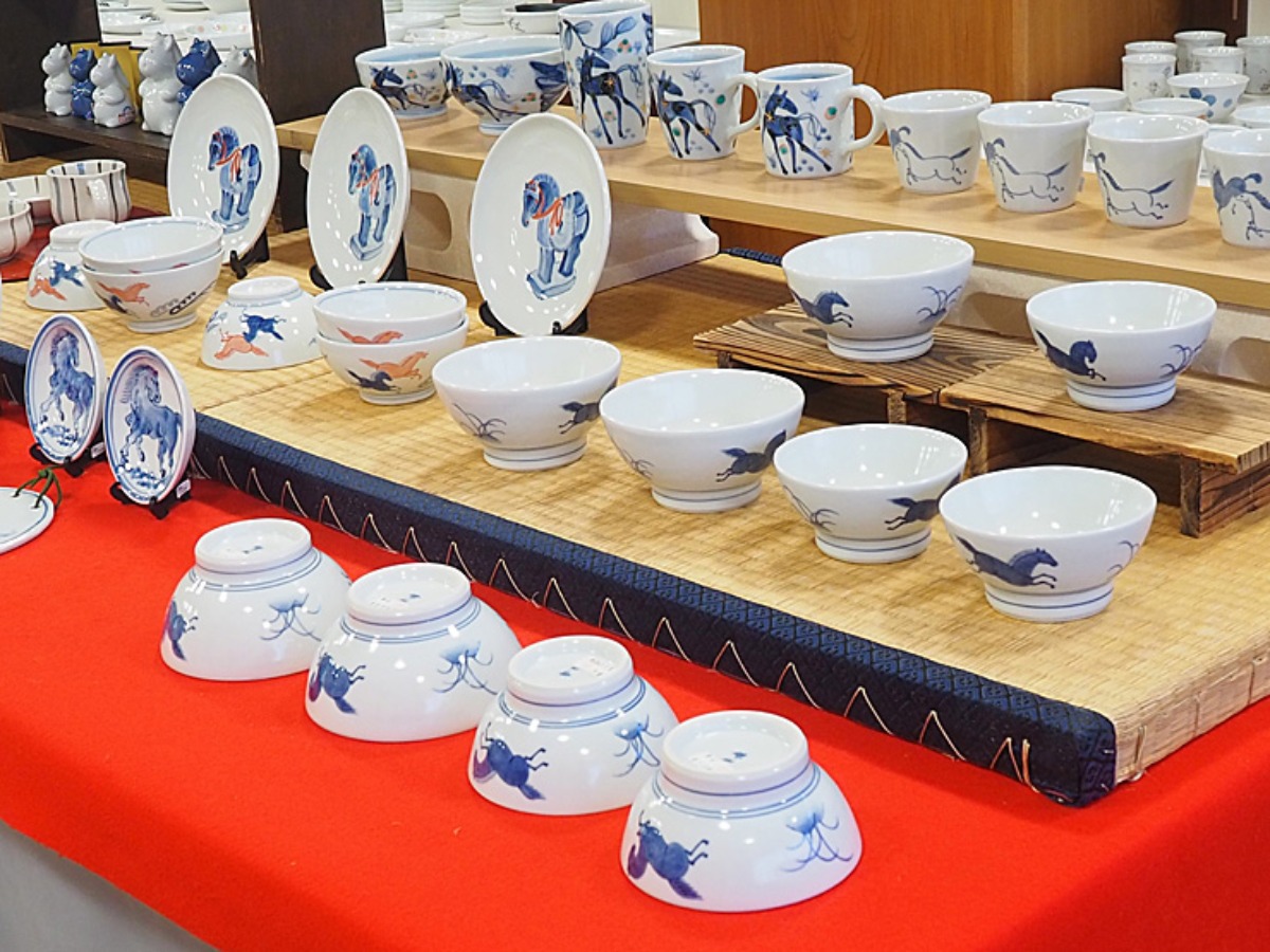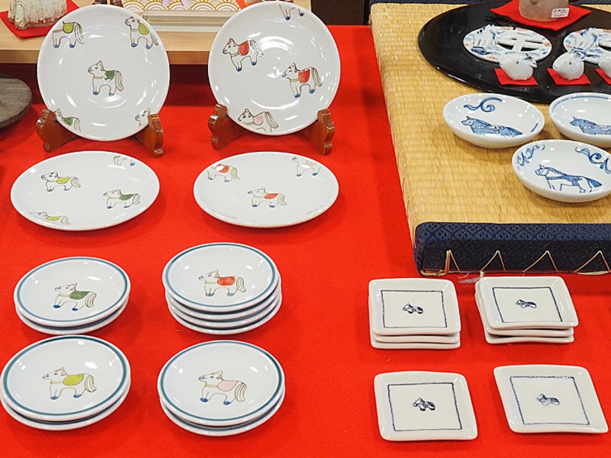 可愛らしい午の置物はもちろん、絵皿や陶板、日常に使えるマグカップや小皿まで幅広いラインナップが勢揃い!