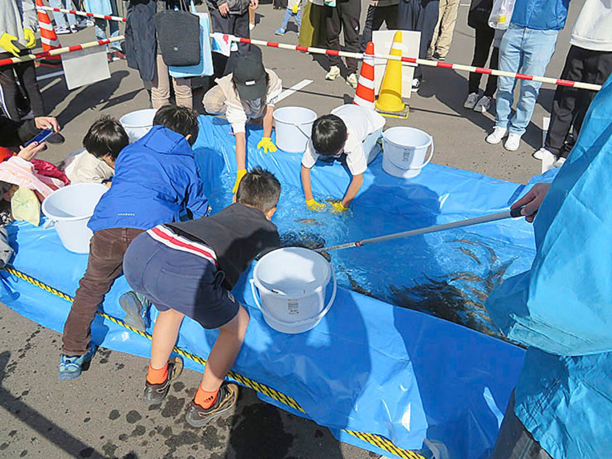 子どもたちに大人気の「魚のつかみ取り」体験では、元気いっぱいに魚を追いかける姿が会場にあふれます。