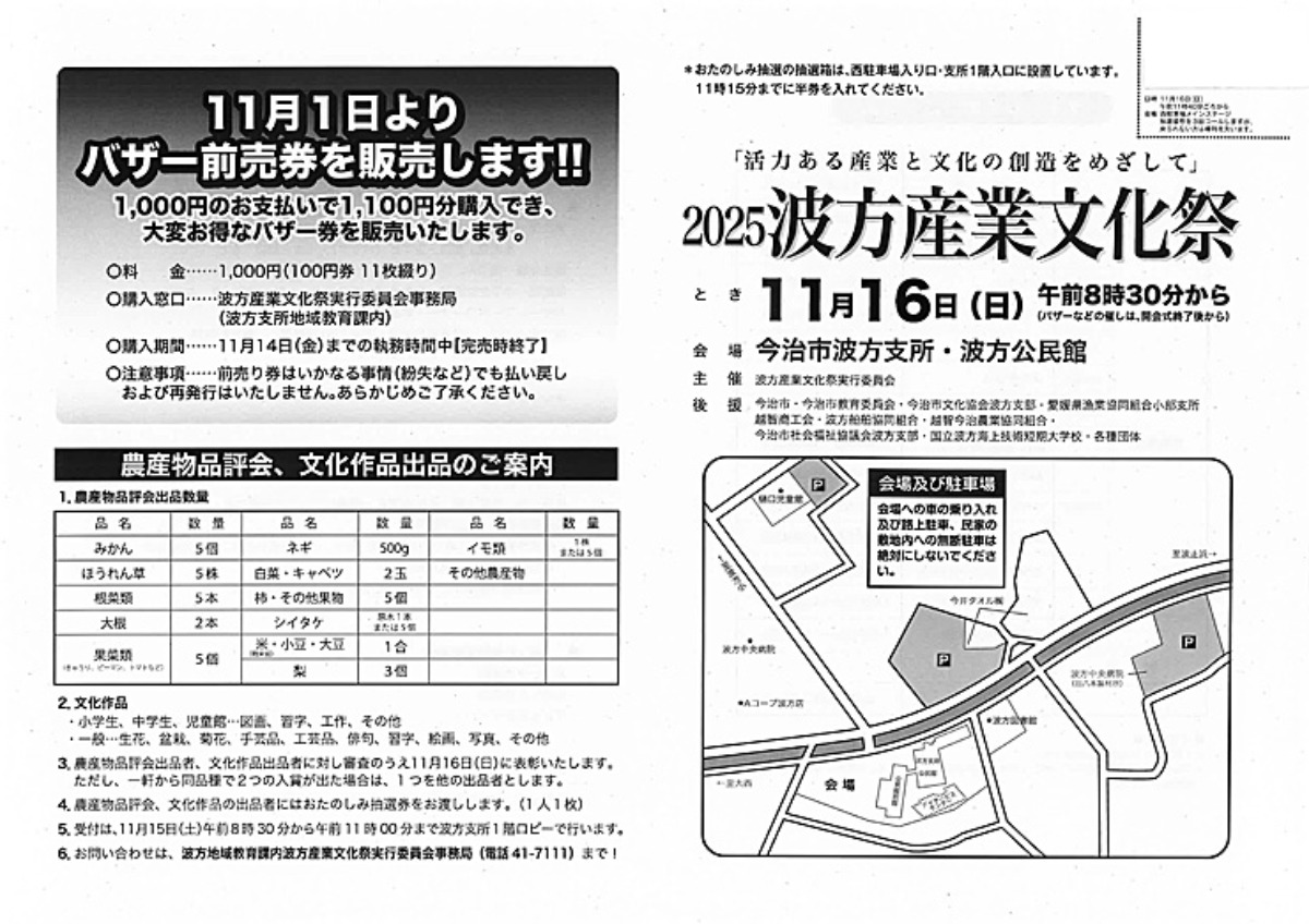 - お問い合わせ: 波方地域教育課内 波方産業文化祭実行委員会事務局