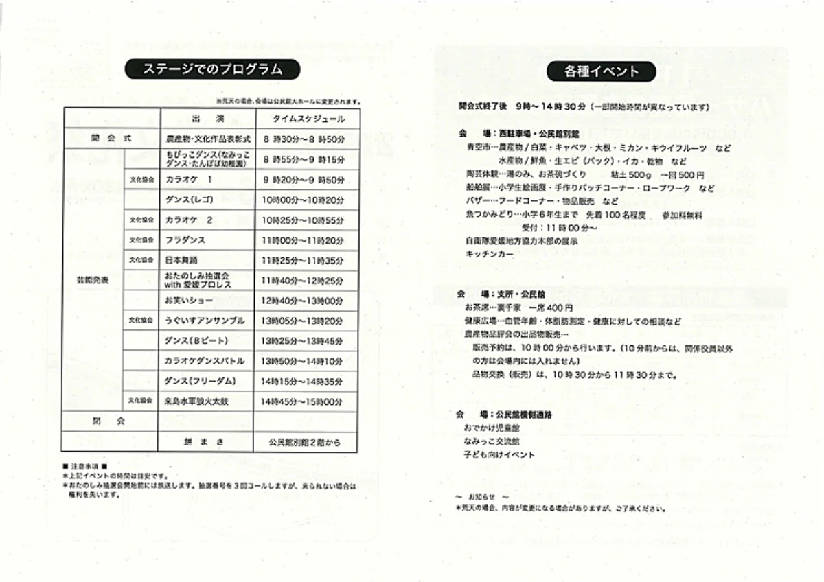 屋外のメインステージでは、文化協会による芸能発表や今治市で人気のダンスチームのパフォーマンス、昨年も好評だった愛媛プロレスやお笑い芸人によるパフォーマンスショーも予定されています。