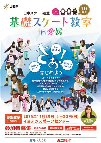 松山市のイヨテツスポーツセンターで開催される「基礎スケート愛媛教室」は、小学1年生以上の初心者向け無料スケート教室。基礎から丁寧に学べる内容で、冬のスポーツデビューにぴったり。抽選制なので申し込みはお早めに!
