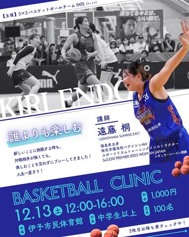 元Wリーガーで現役3×3プレイヤーの遠藤桐選手が指導するバスケットボールクリニック。リオ五輪代表の近藤楓氏もサポート参加!トップアスリートから学べる貴重な機会で、観覧無料の応援もOK。バスケファン必見のイベントです。