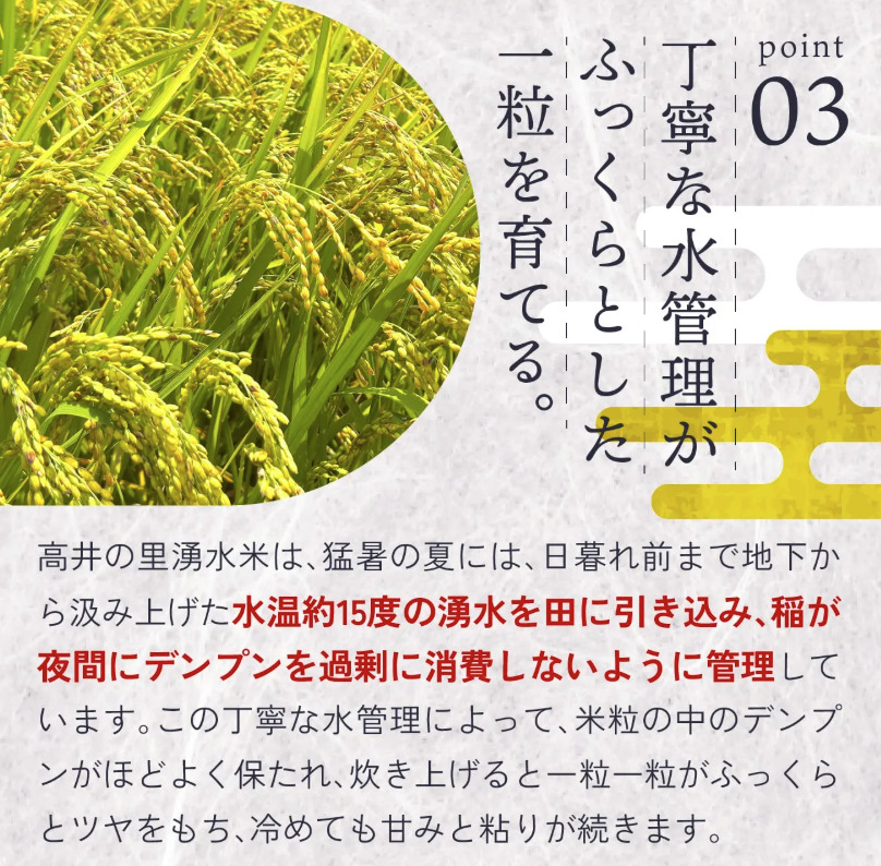 このもちもちとした食感は、冷めても硬くなりにくいのが魅力。だからこそ、ご家庭の普段の食事はもちろん、行楽シーズンのおにぎりやお弁当に入れても、美味しさが続きます。「冷めても美味しいお米を探している」という方に、自信を持っておすすめできる湧き水米です。