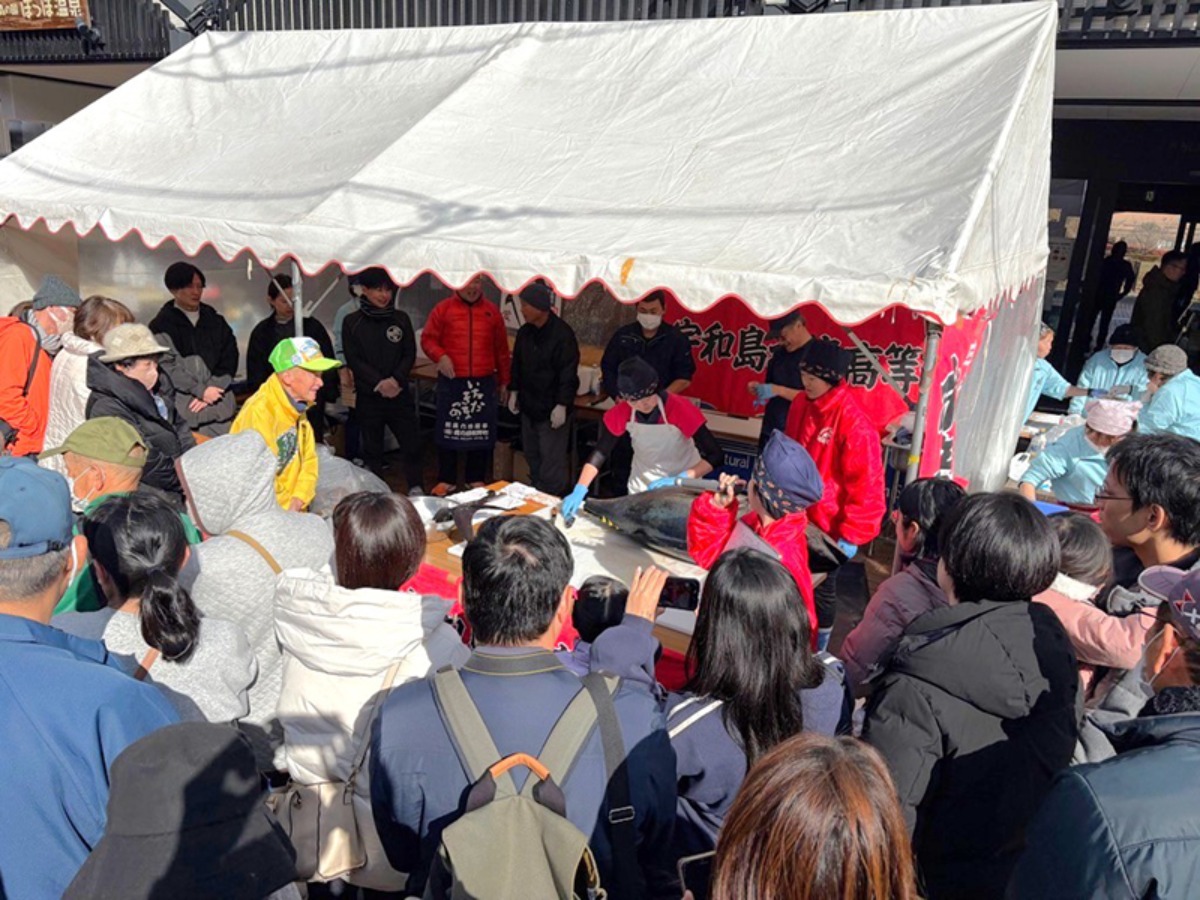 今回、松丸駅前マルシェの目玉企画は、「西条祭りのだんじりの運行」と「宇和島水産高校フィッシュガールによるマグロの解体ショー」。