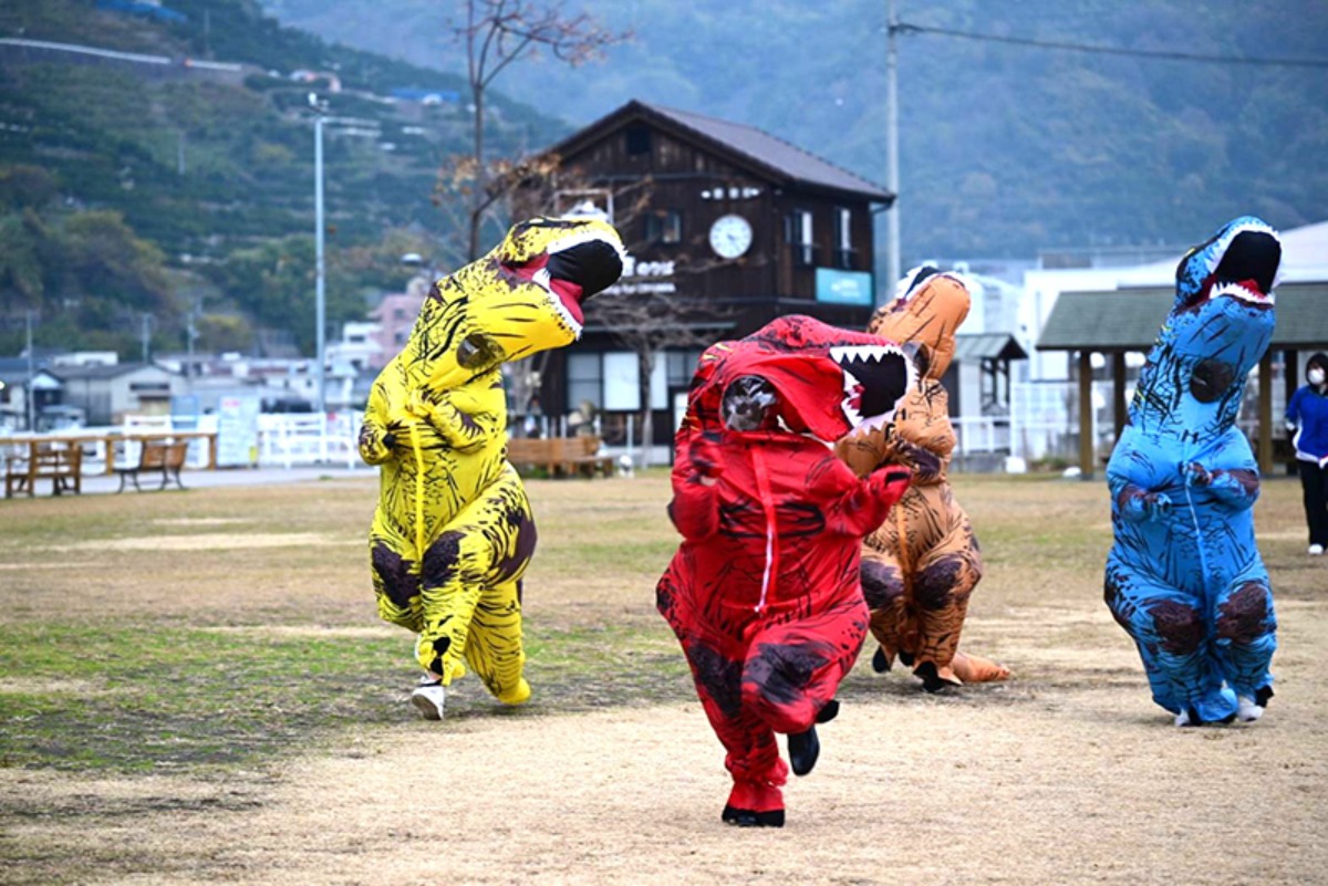 「恐竜レースinみなっと」では、参加者が恐竜の着ぐるみを着て、みかんオブジェの周りを全力で走ります。