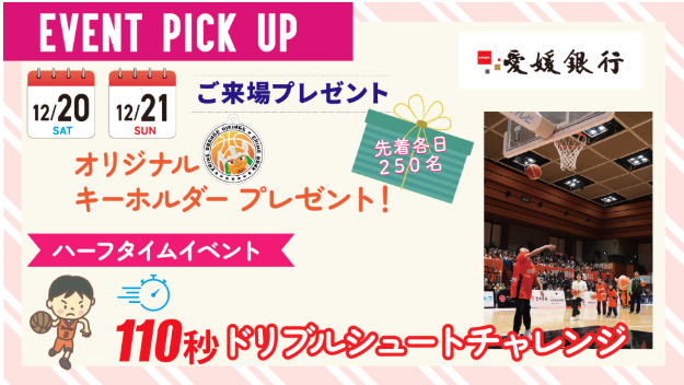 《GAME PARTNER》の愛媛銀行からは、各日先着250名様にオリジナルキーホルダーがプレゼントされます。また、ハーフタイムには愛媛銀行presentsの「110秒 ドリブルシュートチャレンジ」を実施!参加ご希望の方は、ぜひ愛媛銀行ブースへお越しください。