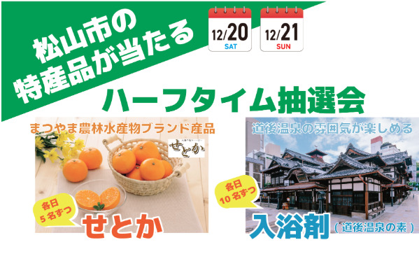 松山市ブース:せとか(各日5名ずつ)や道後温泉の素(各日10名ずつ)が当たるハーフタイム抽選会を実施します。