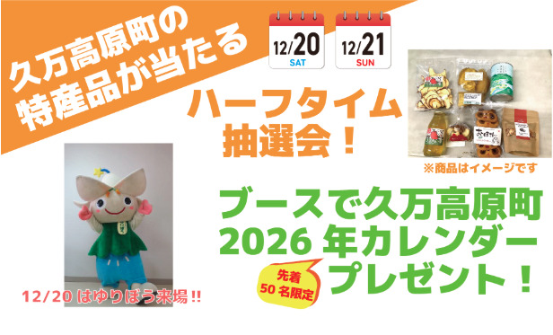 久万高原町ブース:久万高原町の特産品が当たるハーフタイム抽選会が行われます。さらに12月20日(土)はゆるキャラの「ゆりぼう」が来場!ブースでは久万高原町2026年カレンダーを先着50名様限定でプレゼントします。