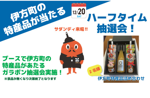 伊方町ブース(12/20土のみ):12月20日は伊方町特産品詰め合わせが当たるハーフタイム抽選を実施。さらに「サダンディー」がやってくるほか、特産品があたるガラポン抽選会も実施されます(景品が無くなり次第終了)。