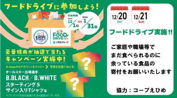 12月20日(土)・21日(日)の両日、フードドライブ(家庭などで余っている食品の寄付)を実施いたします。(協力:コープえひめ)