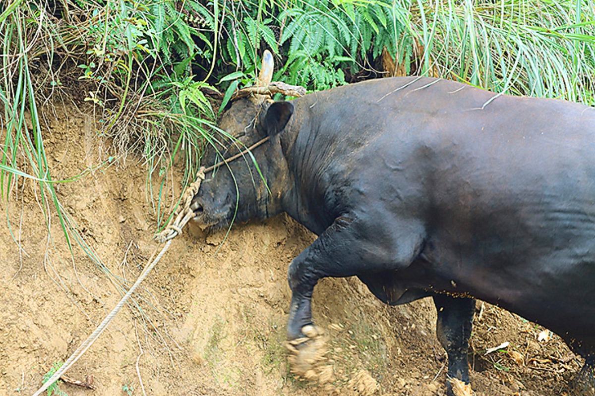 時間無制限・鼻綱なしで向き合う2頭の牛が、どちらかが逃げるまで全力でぶつかり合います。