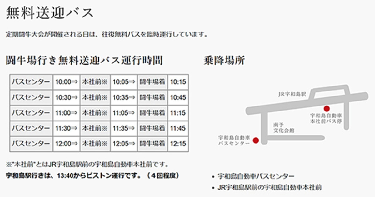 大会当日は臨時駐車場も用意されていますが、混雑が予想されるため、宇和島自動車バスセンターからの無料送迎バスの利用が推奨されています。