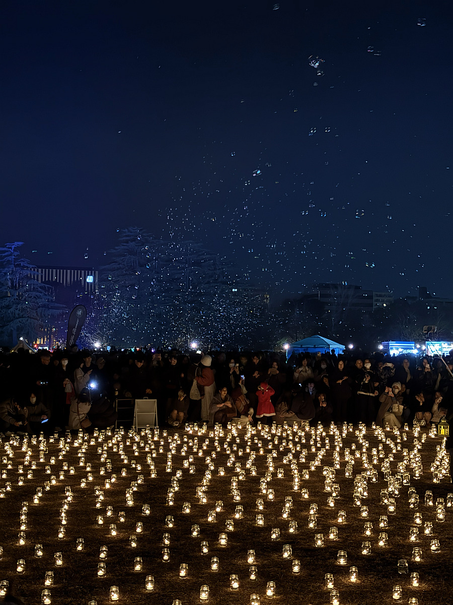 クリスマスナイト愛媛2025は、6,000個のキャンドル、幻想的なシャボン玉ショー、100店舗の出店、5,000本のお花のフォトブースなど、見どころ満載のイベントでした。