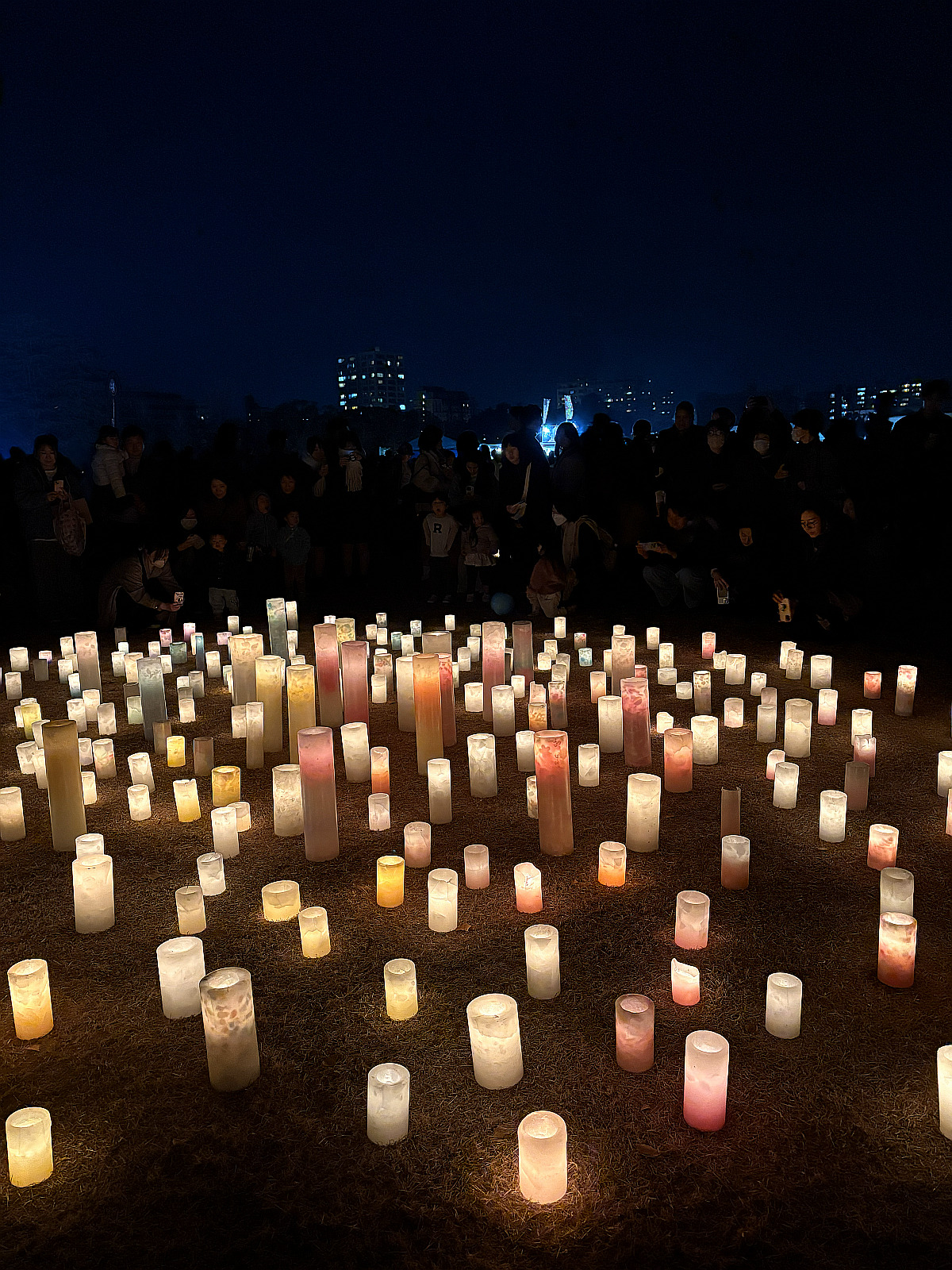 ひとつひとつ丁寧に配置されたキャンドルが、冬の夜空の下で優しく揺れる様子は、まるで星が地上に降りてきたかのよう。訪れた人々は思わず立ち止まり、その美しさに見入っていました✨