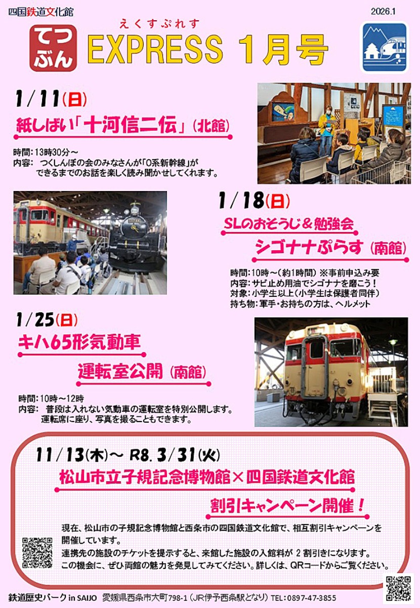 西条市の四国鉄道文化館では、2026年1月限定で親子で楽しめるスペシャルイベントが3週連続開催されます。