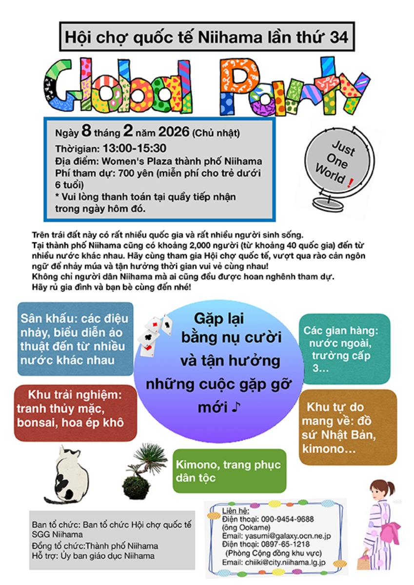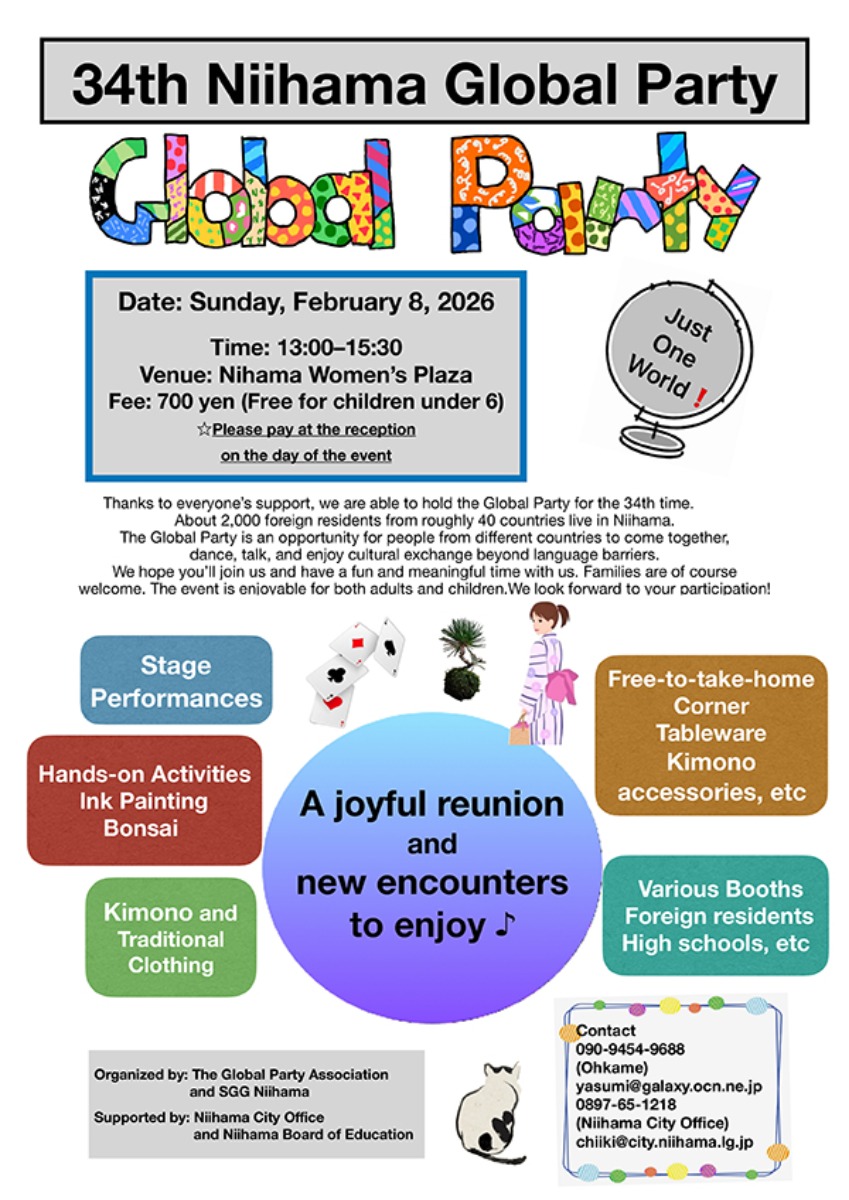 毎年多くの参加者で賑わう「新居浜グローバルパーティー」が、2026年も新居浜ウィメンズプラザで開催決定♪