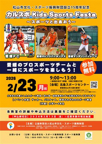 松山市文化・スポーツ振興財団設立15周年を記念して開催される「カルスポkids Sports Festa」。愛媛FCや愛媛オレンジバイキングスなど地元プロチームによる小学生向けのスポーツ体験イベント。楽しみながらスポーツの魅力を体感しよう!
