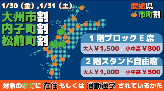 大洲市・内子町・松前町に在住・通勤・通学されている方は、2階スタンド自由席が大人1,000円、小中高500円に!31日は大洲銘菓「志ぐれ」のプレゼントもあります。