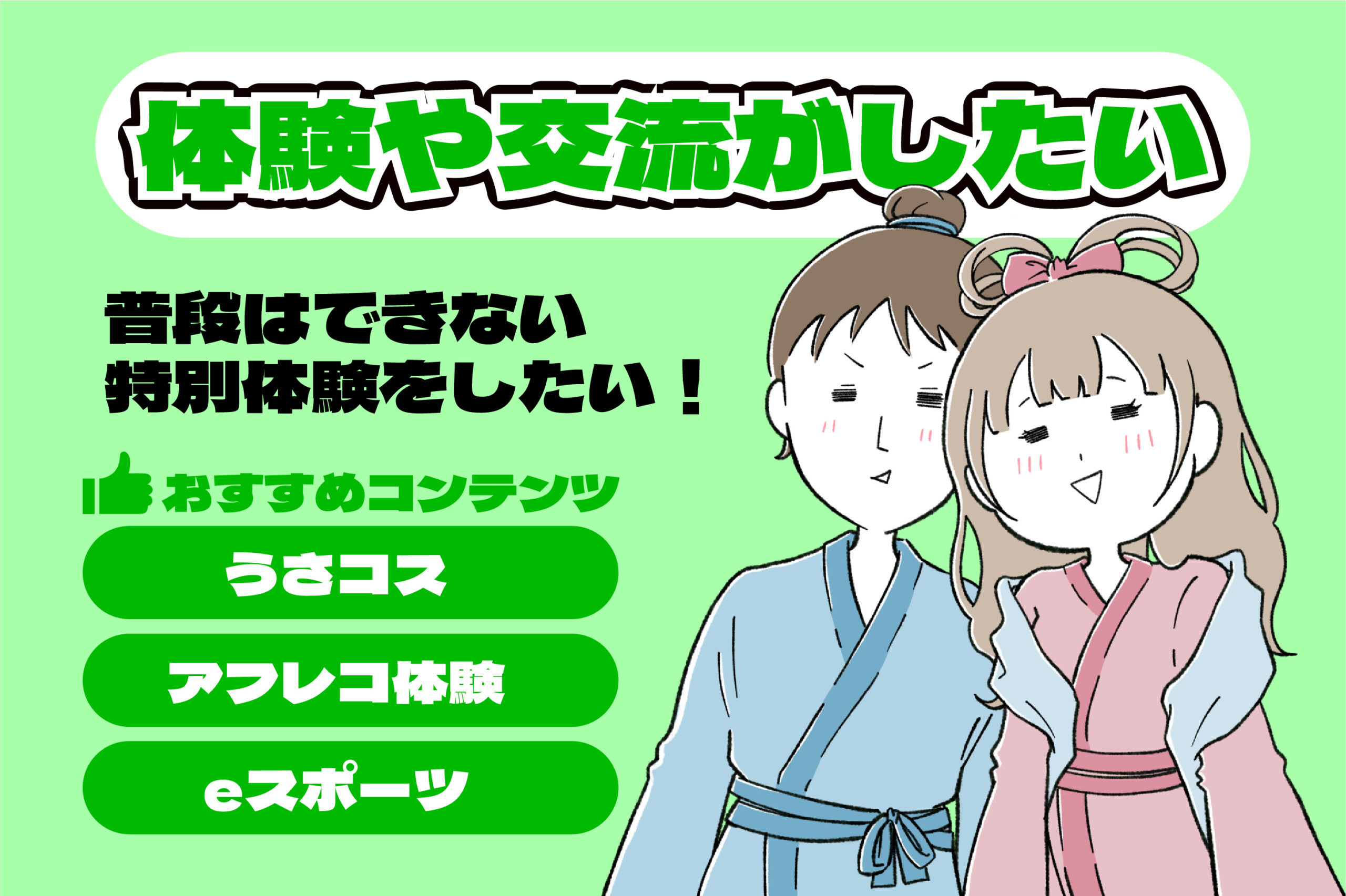 普段はできない体験をしてみたい。仲間と一緒に楽しんだり、同じ趣味を持つ人と交流を深めたい。そんなあなたには「うさコス(コスプレ体験)」「アフレコ体験」「eスポーツ」がおすすめです。