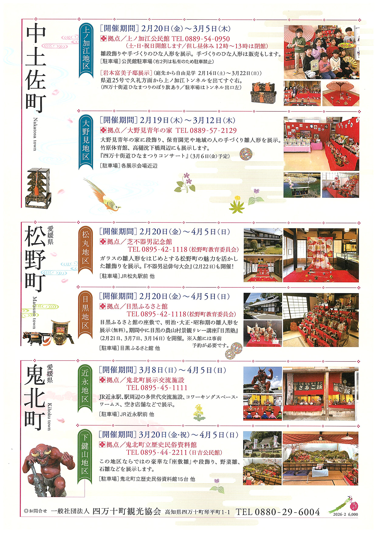 駐車場が満車の場合はスタッフへお声がけください。春の鬼北町を散策しながら、やさしいおひな様たちに会いに出かけてみませんか。🌸🎎