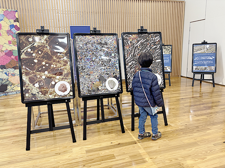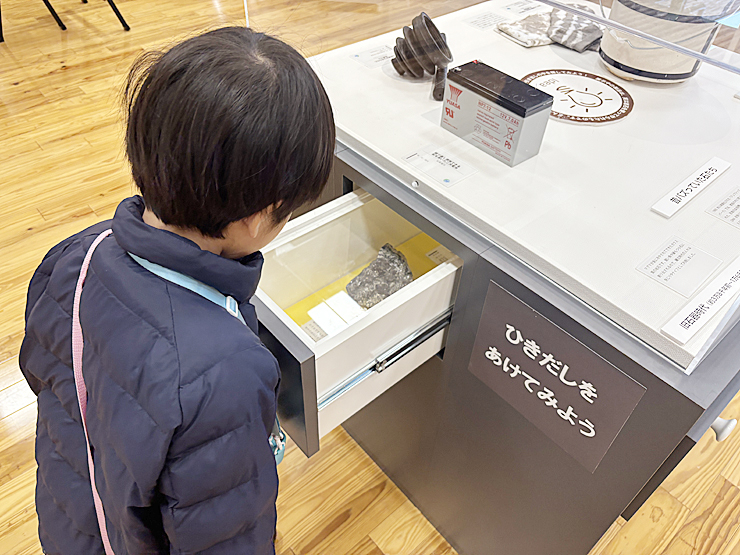 「ひきだしをあけてみよう」と書かれた展示台では、引き出しを一つひとつ開けながら、中に入ったさまざまな石を楽しそうに観察していました。