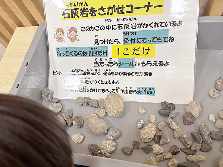 子どもが夢中になっていた石灰岩探しのコーナー。たくさん並ぶ石は、どれも色や形が違っていて、見ているだけでおもしろい発見があります。