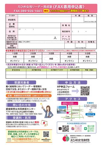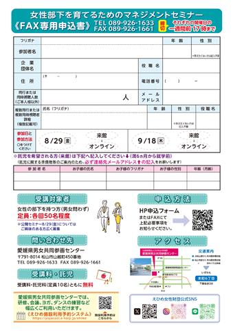 ※HP申込みフォーム、FAXでの申込み、えひめ女性リーダー育成塾・女性部下を育てるためのマネジメントセミナー(R7年7月11日(金)~、無料託児(満6ヶ月から就学前のお子さん)あり、休館日:月曜、祝日