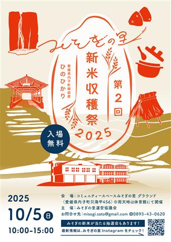第2回 みそぎの里新米収穫祭 0893-43-0620 misogi.sato@gmail.com 雨天時は体育館にて開催 |