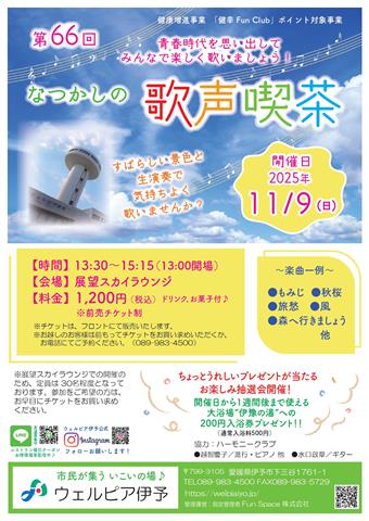 参加者全員で、なつかしの名曲などを楽しく歌うイベント。ウェルピア伊予自慢の展望スカイラウンジなので、景色のヨ良さは特筆もの! ちょっとうれしいプレゼントが当たるお楽しみ抽選会も楽しみ。